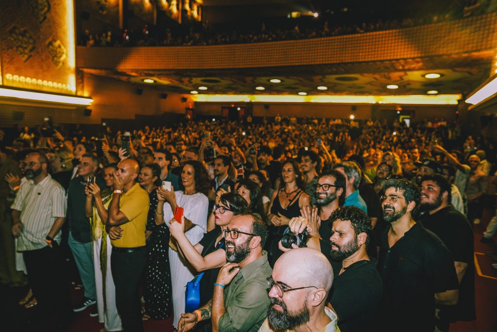 Povo pernambucano celebrando a estreia nacional de O Agente Secreto na reinauguração do Cine São Luiz